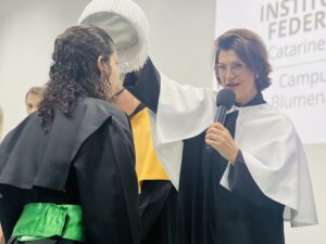 A cerimônia foi presidida pela pró-reitora de Ensino do Instituto Federal Catarinense, professora Liane Vizzotto. Em seu discurso, ela lembrou que a instituição oferta 49 cursos superiores. “Nós, o IFC, damos oportunidade de acesso, de permanência, de êxito por meio da variedade dos cursos, das bolsas, dos projetos de ensino, pesquisa e extensão e formamos profissionais em sua integridade, do mais alto nível e competência técnica. Além disso, formamos para a diversidade. Quantas mulheres estão sentadas aqui hoje se formando? O nosso IFC é, sobretudo, inclusivo”.