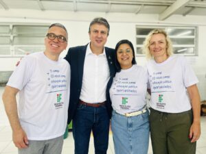 O Instituto Federal Catarinense (IFC) Campus Blumenau recebeu a visita do Ministro da Educação (MEC), Camilo Santana, na manhã da última terça-feira (9). O Reitor do IFC, Rudinei Exterckoter, e o Diretor-geral do Campus Blumenau, Aldelir Fernando Luiz, estiveram à frente da comitiva de recepção no campus. A visita contou ainda com a presença de Marcelo Bregagnoli, da Secretaria de Educação Profissional e Tecnológica; dos deputados federais Ana Paula Lima e Pedro Uczai, do vereador de Blumenau Jean Volpato, além de todos os diretores-gerais dos campi do IFC e dirigentes da Reitoria.