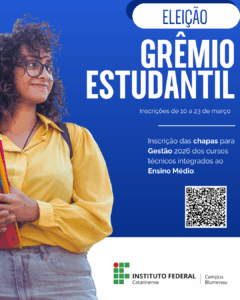 O Instituto Federal Catarinense (IFC) Campus Blumenau publicou edital de convocação para inscrição das chapas que concorrerão às eleições do Grêmio Estudantil, para a gestão 2026. As inscrições das chapas vão até 23 de março e deverão ser entregues por meio de formulário eletrônico, conforme prevê o edital.